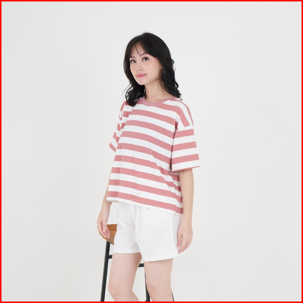 Queentin Kaos Wanita Casual 0623 Stretch Caramel Knit Motif Salur Lengan Pendek