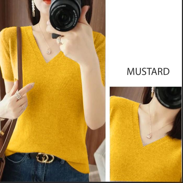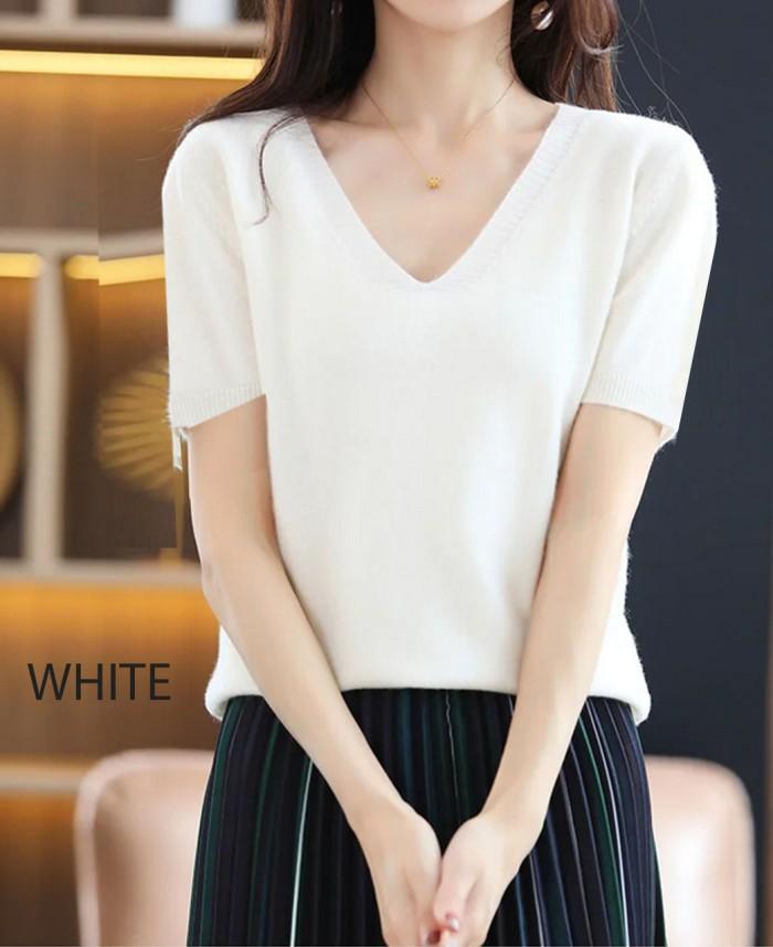 V NECK SHORT SLEEVE BLOUSE SWEATER KNIT WANITA - BLACK