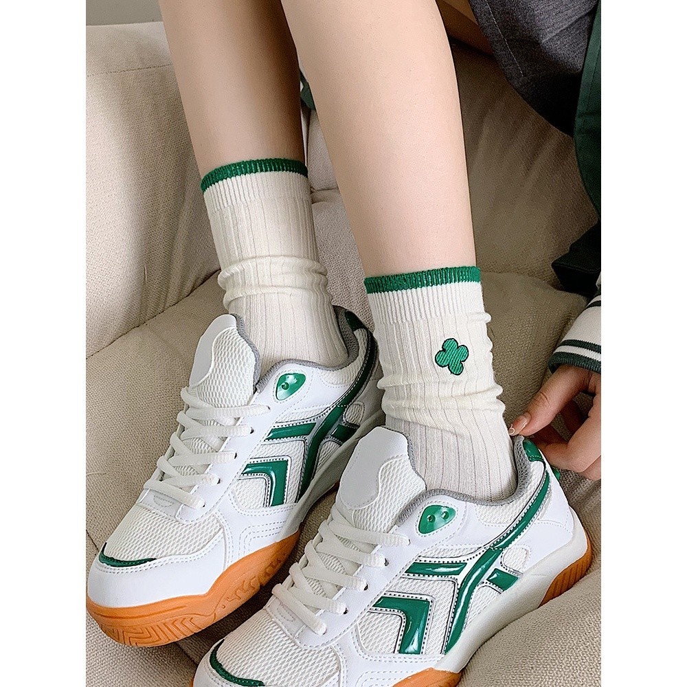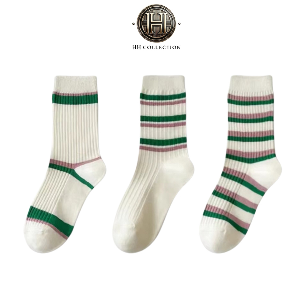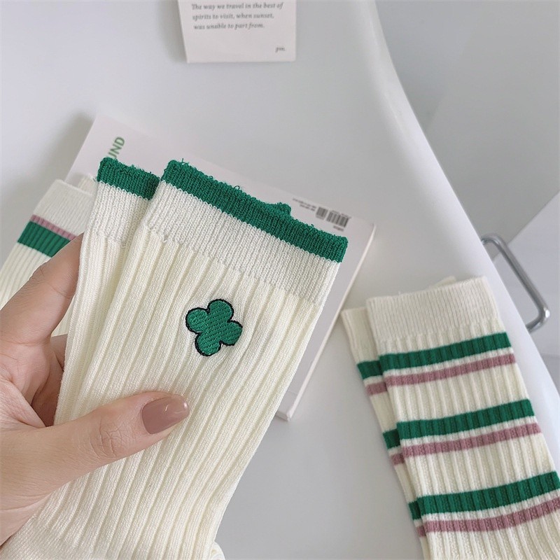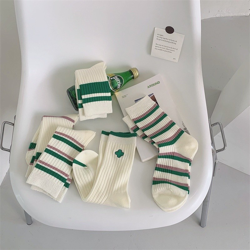 Kaos Kaki Panjang 6881 KaosKaki Motif Garis Belang Putih Hijau Kaus Kaki Gambar Clover Setinggi Betis Sarung Kaki