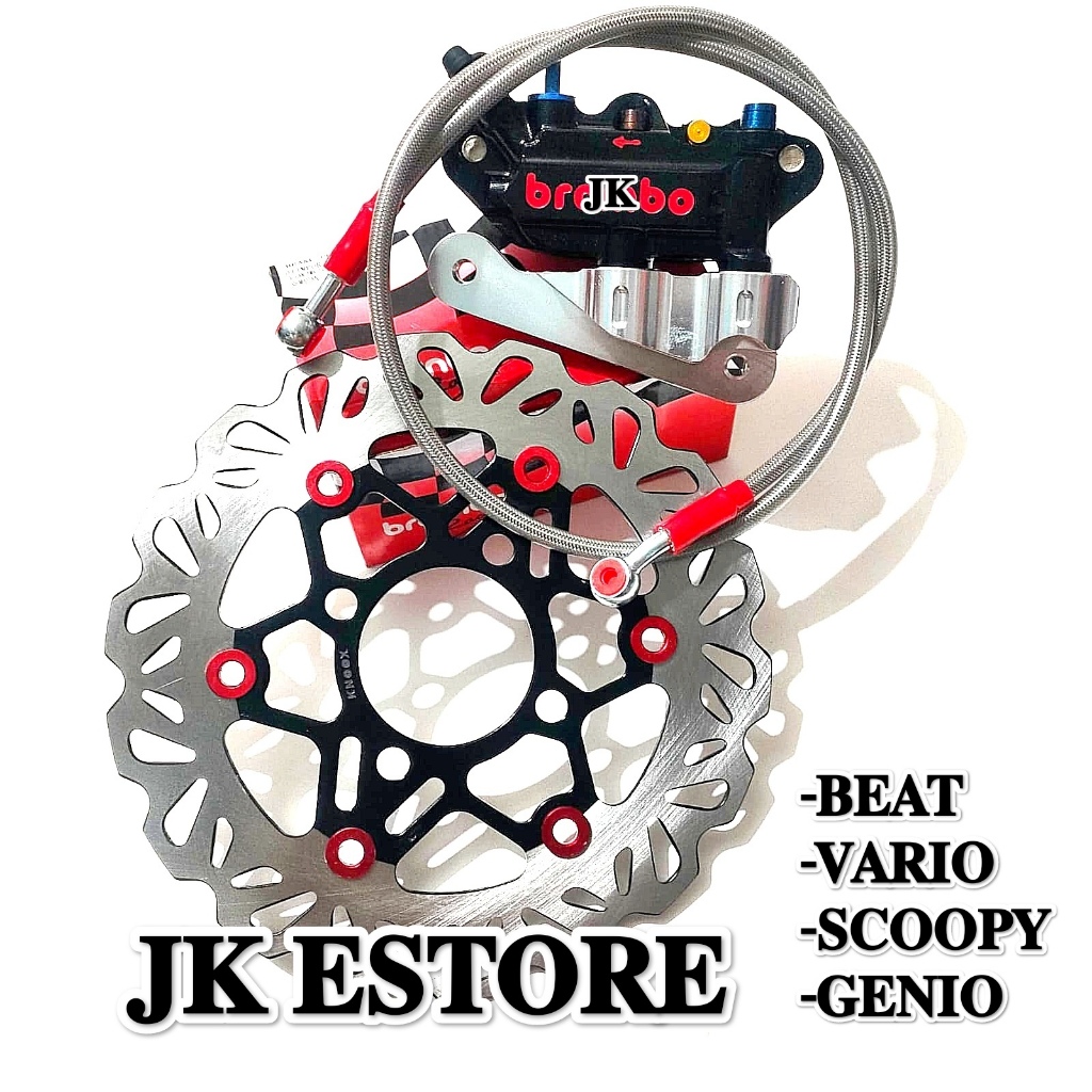 Paket Kaliper Kiri 4 Piston + Breket Kiri Beat, Vario, Scoopy, Genio + Selang Rem 95CM + Piringan Gerigi 220MM + Baut Ke