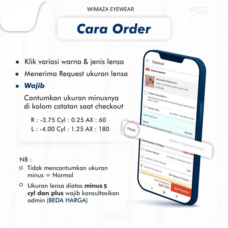 Hitam Polarized, CRMC MINUS/NRML, BLUERAY MINUS/NORMAL, PHOTOCROMIC MIN/NRML, BLUCHROMIC MIN/NRML, LENSA CUSTOM WARNA, FRAME ONLY
