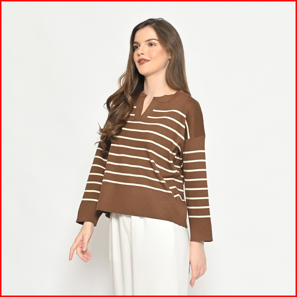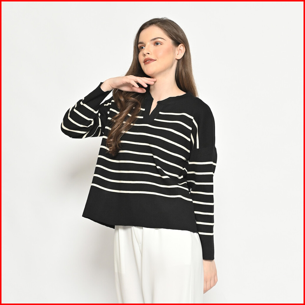 Queentin Sweater Wanita Rajut Crop 419 Stretch Cashmere Knit Motif Salur Lengan Panjang