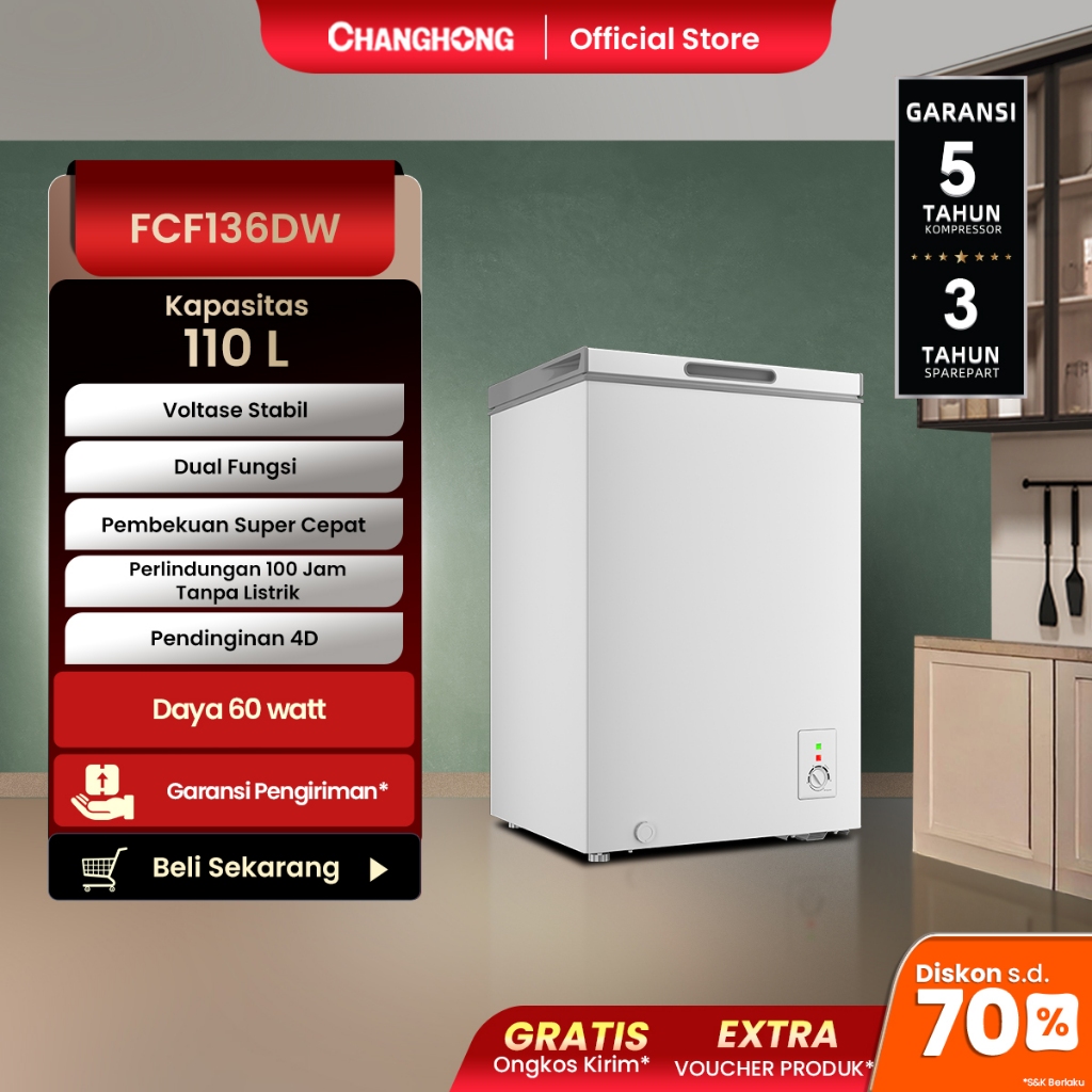 Changhong Chest Freezer FCF136DW Kapasitas 110 Liter (Fast Freezing) (Design Look Minimalis) ( Big Capacity) (Voltase Yang Stabil)