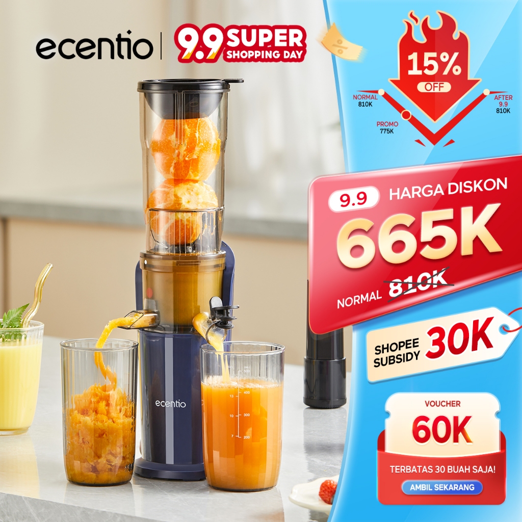 ecentio Slow Juicer Extra Big Mouth 82mm Easy Juice Filter-Free Low Watt Easy Clean Tanpa Potong Buah Multifungsi Juicer Food Grade