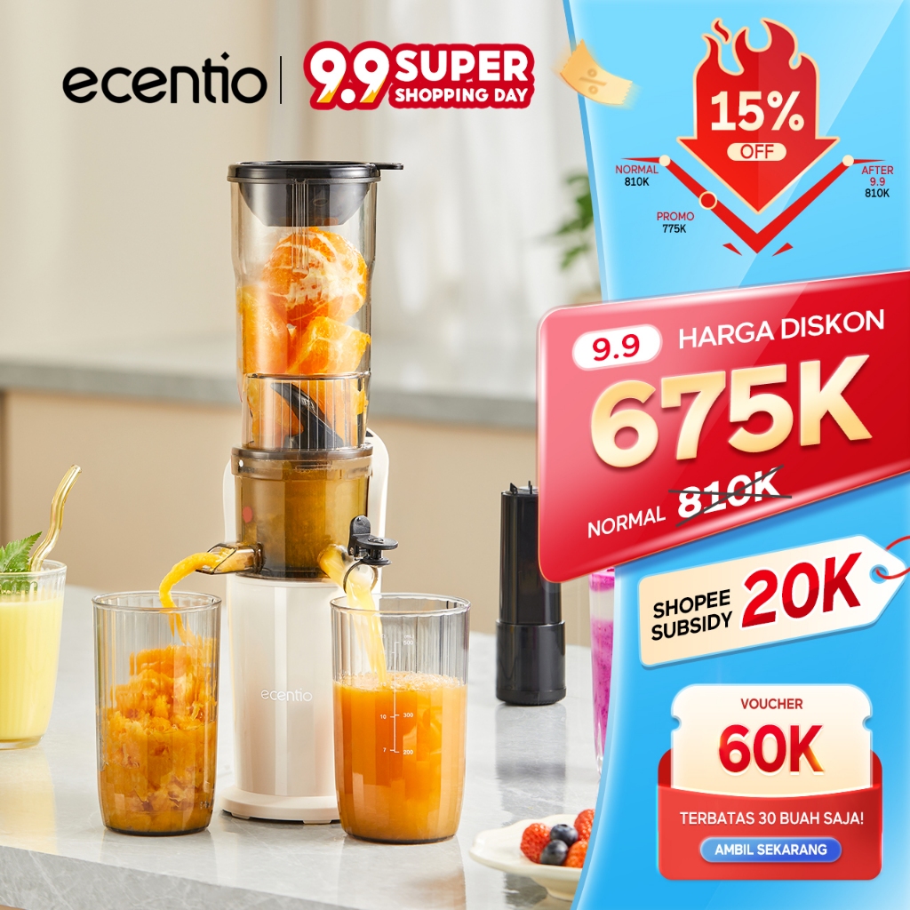 ecentio Slow Juicer Cold Press Easy Juice Filter-Free Easy Clean 82mm Extra Big Mouth 150W Low Watt Tanpa Potong Buah Multifungsi