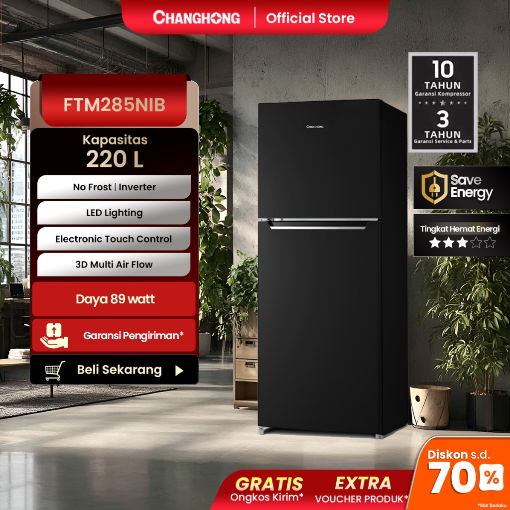 Changhong Kulkas 2 Pintu (Refrigerator) kulkas Inverter No Frost tanpa Bunga Es Lemari Es Kapasitas 220 Liter FTM285NIB - Black