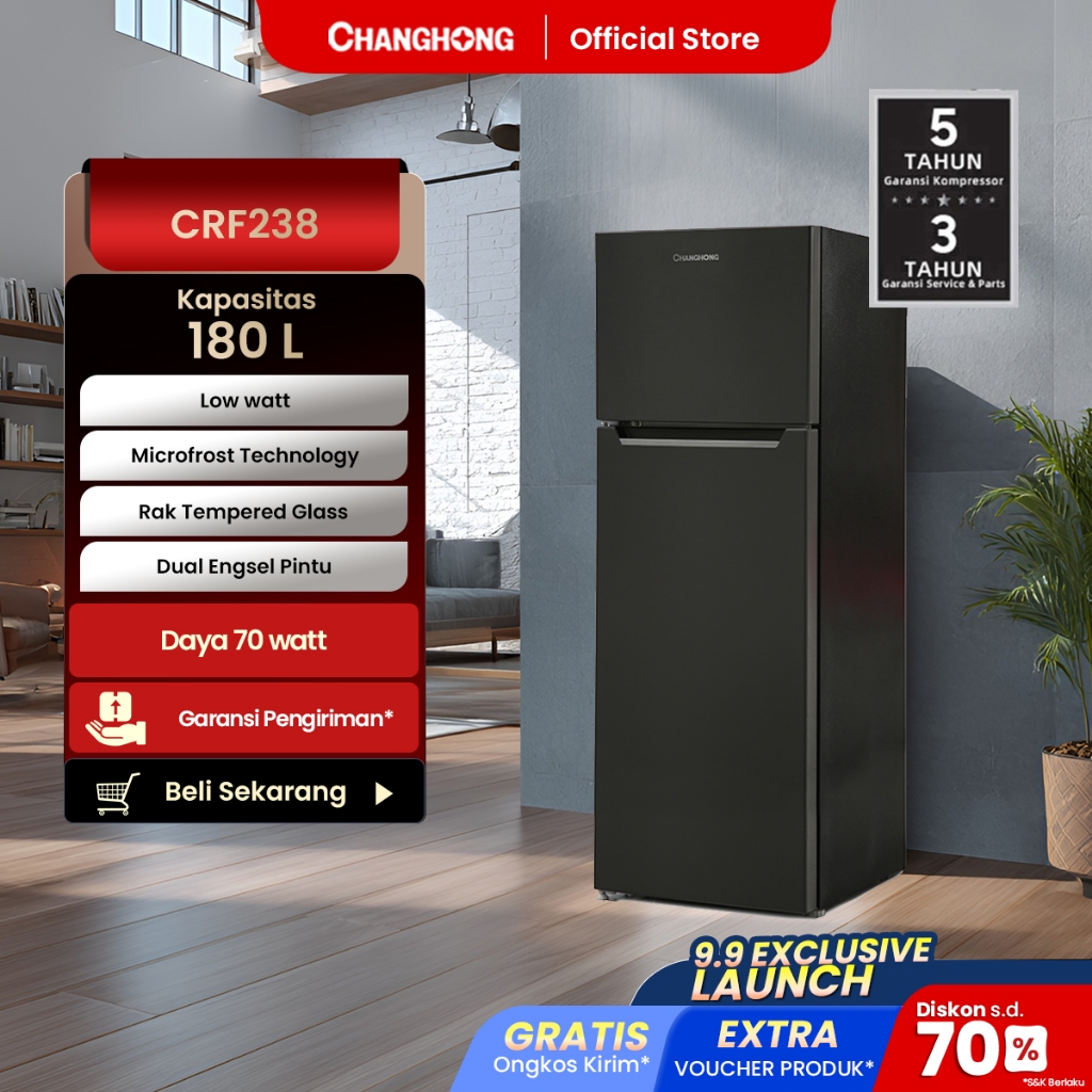 Changhong Kulkas 2 Pintu (Refrigerator) Lemari Es Kapasitas 180 Liter CRF238 – Black (Semi Auto No Frost) (Kapasitas Besar) (Tempered Glass)