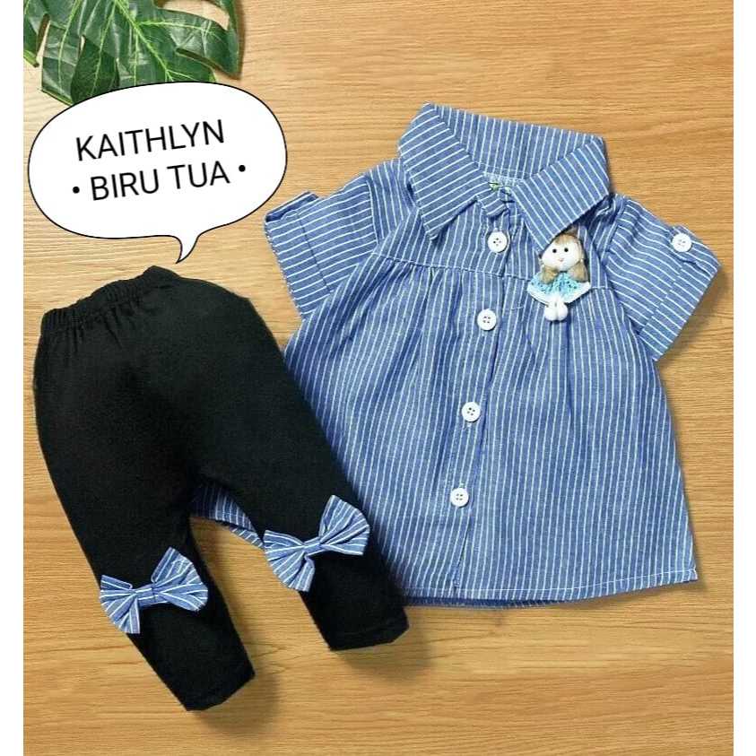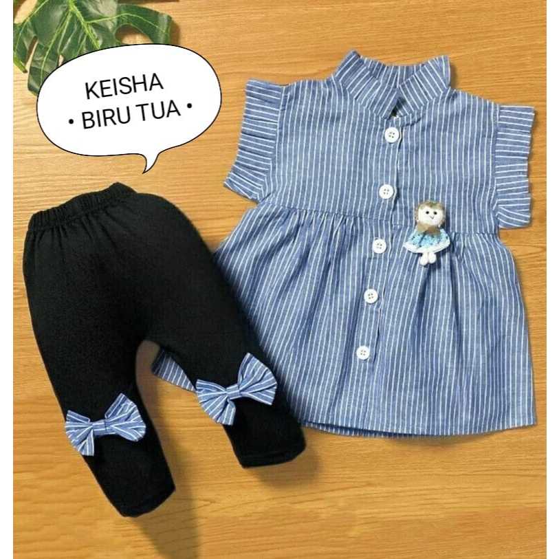 Setelan Baju Anak Perempuan / Baju Bayi Cewek Atasan Lengan Pendek Dan Celana Panjang Motif Keisha Denim Usia 0-6 Bulan