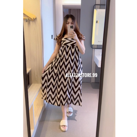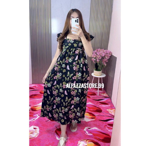 ALFAZZA LONG SUMMER DRESS Ruffle Babydoll Motif Casual Fit Rayon Viscose Lembut Outfit Pantai kekinian