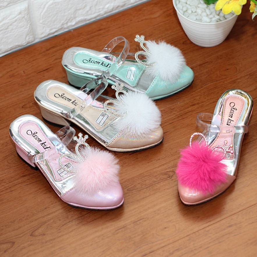 Sandal Sepatu Anak Perempuan Hak 3 cm Motif Bulu Kitty Mika Bening Heels Selop Pesta Cewe Tahun SM1