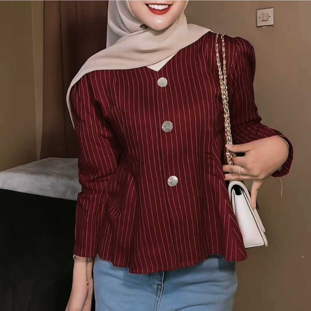 Arika Blouse Stripe Atasan Peplum Wanita Salur Lengan Puff Fit Body Fitted - Blouse Atasan Wanita