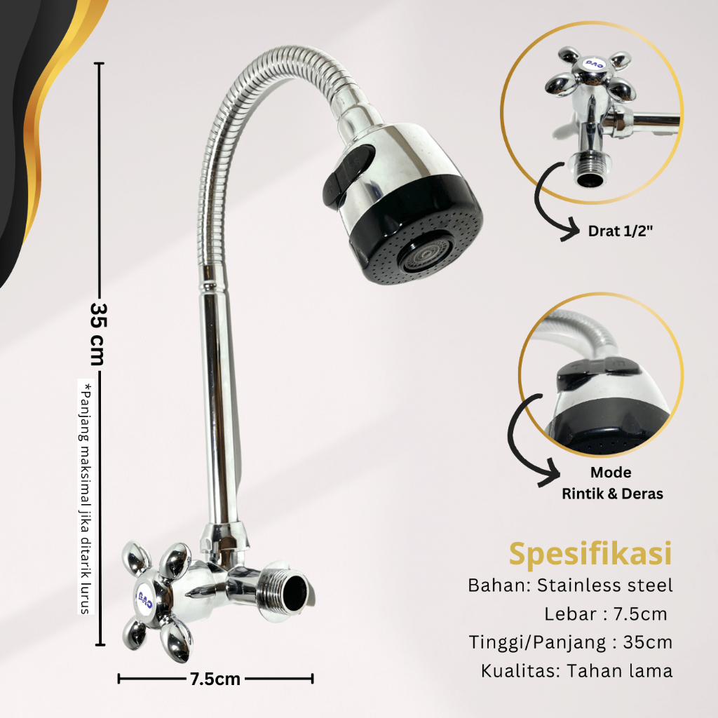 Kran Angsa Cuci Piring Fleksibel STAINLESS Kepala Besar 2 Tipe Pancuran / Keran Angsa Besi Flexible 2 Mode Water Spray