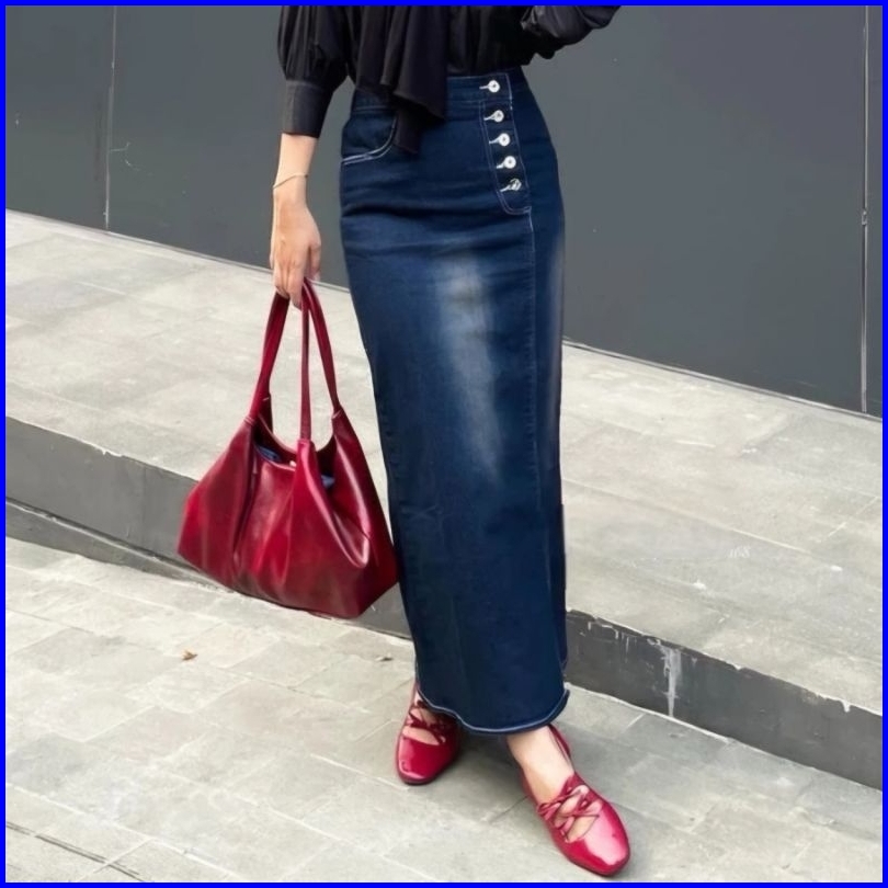 Moren- Highwaist Rok Jeans Korean Style Rok Span Rawis Wanita Denim Rok Panjang