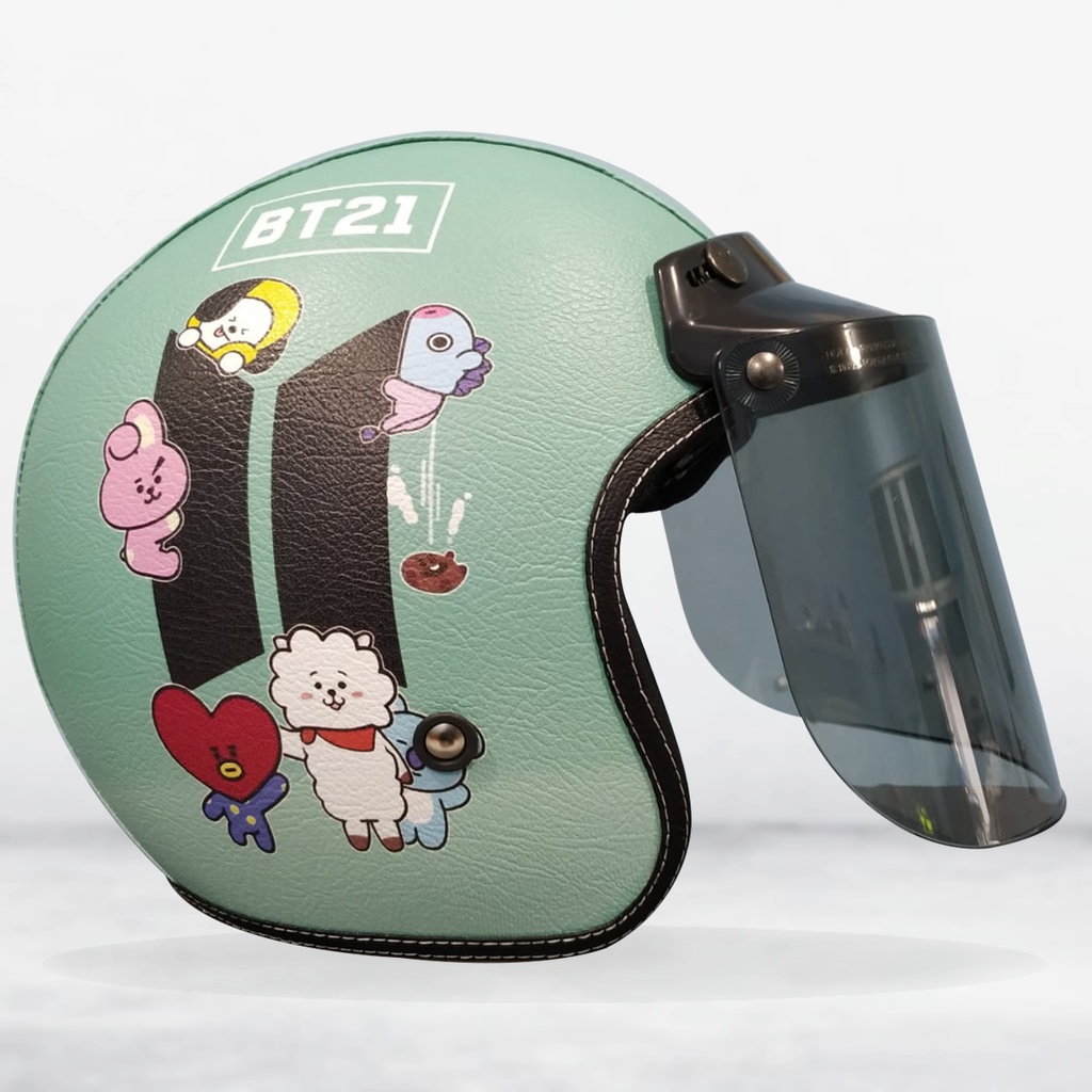 Helm Retro Bogo Kulit BTS Hijau Kaca Bubble Halfface Helmet Helm Motor