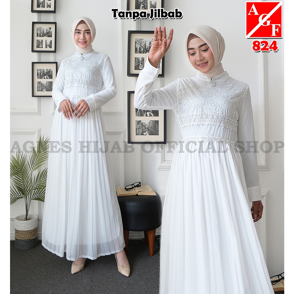 [ Clearance SALE ] Agnes Hijab Gamis Putih Baju Muslim Wanita Lebaran Haji Umroh Termurah