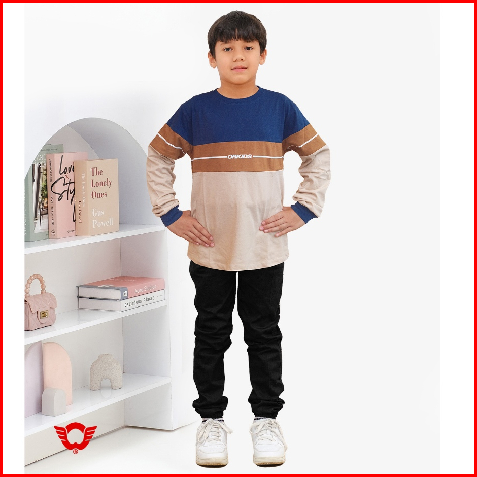 Baju Kaos Anak Lengan Panjang Umur 1 - 12 Tahun Bahan Katun Combad 24s Orkids Runz Steel Blue Cream