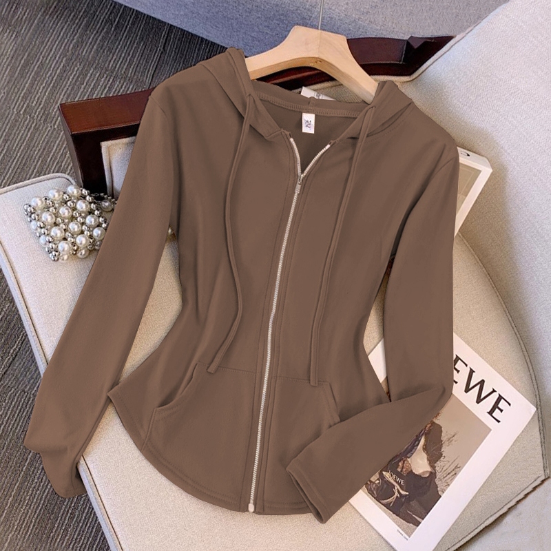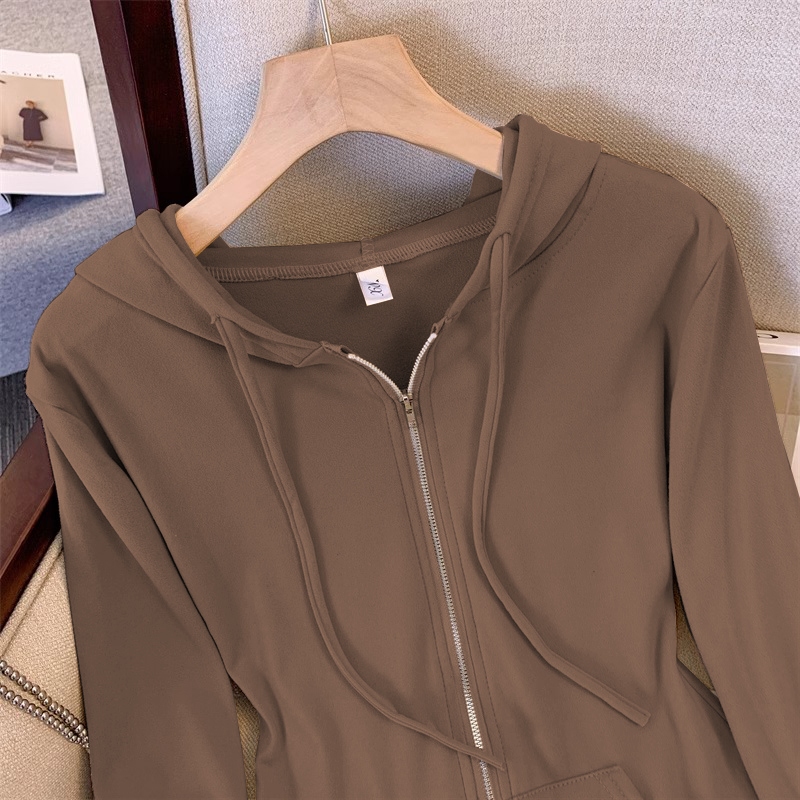 Cardigan hoodie resleting coklat stylish, crop top lengan panjang ala korea, atasan terbaru untuk wanita