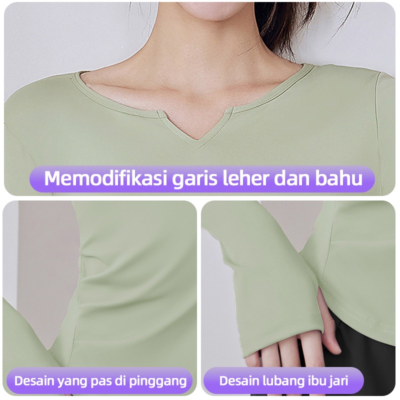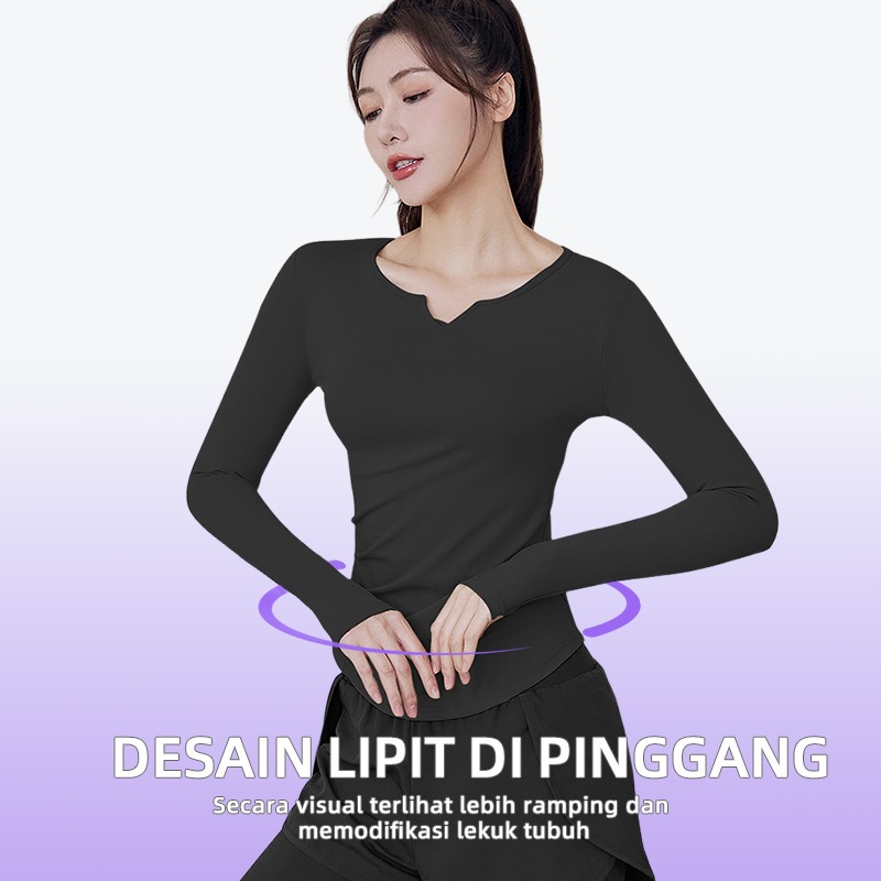 Owngrace Baju Atasan Olahraga Wanita V-neck lengan panjang T-shirt bernapas cepat kering pakaian yoga atasan olahraga pinggang ramping ketat