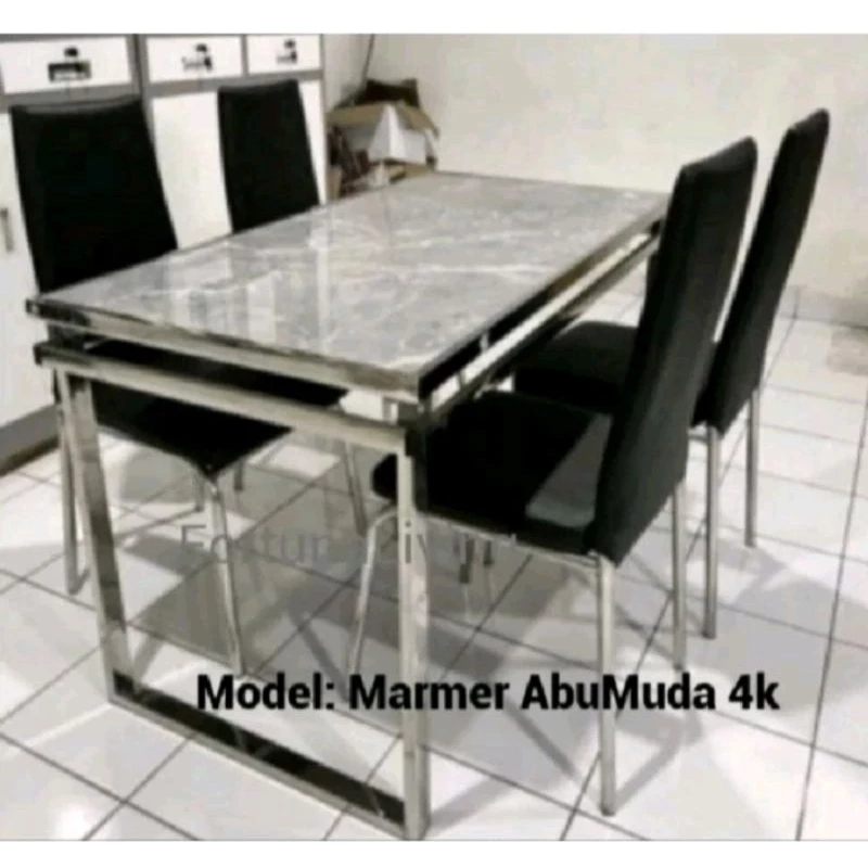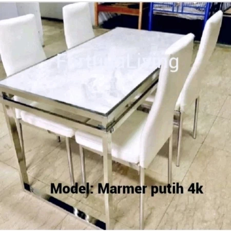 Meja Makan Marmer Minimalis Set 4 Kursi Rangka Besi Stainless Dining Table