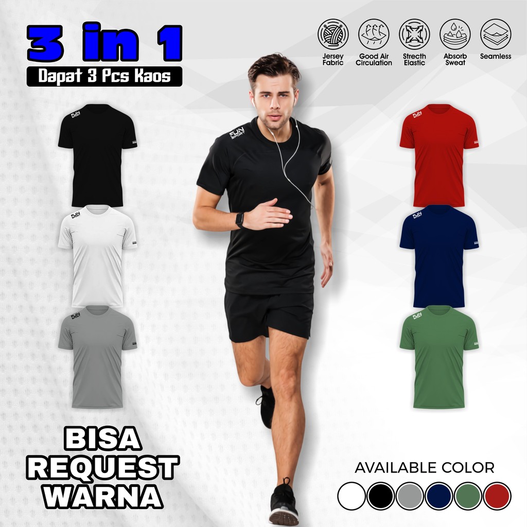 Jersey Paket 3 pcs Baju Kaos Olahraga Lari t shirt Pria Fun Sport Bahan Dry Fit Breathable Quickdry