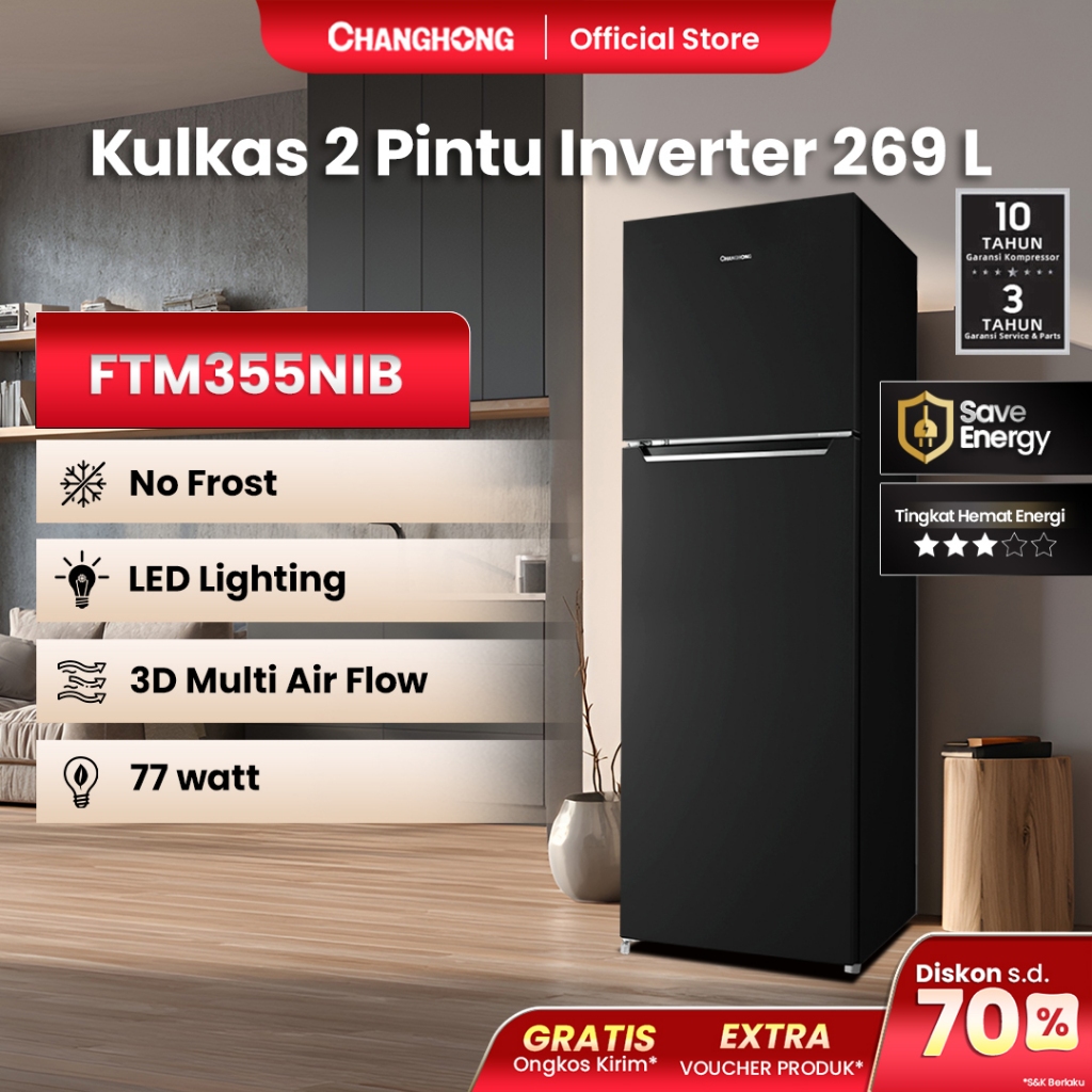 Kulkas Changhong 2 Pintu Inverter No Frost 269 Liter FTM355NIB Hitam Hemat Energi Termurah Terbaru