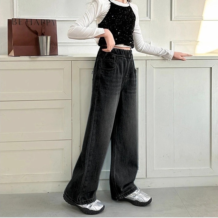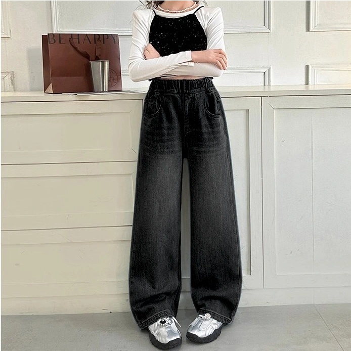 Hitam — Celana Jeans Anak Perempuan Wide Leg Korean Style Celana Denim High Waist Remaja Kekinian, Celana Baggy Santai N