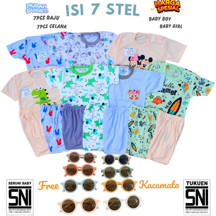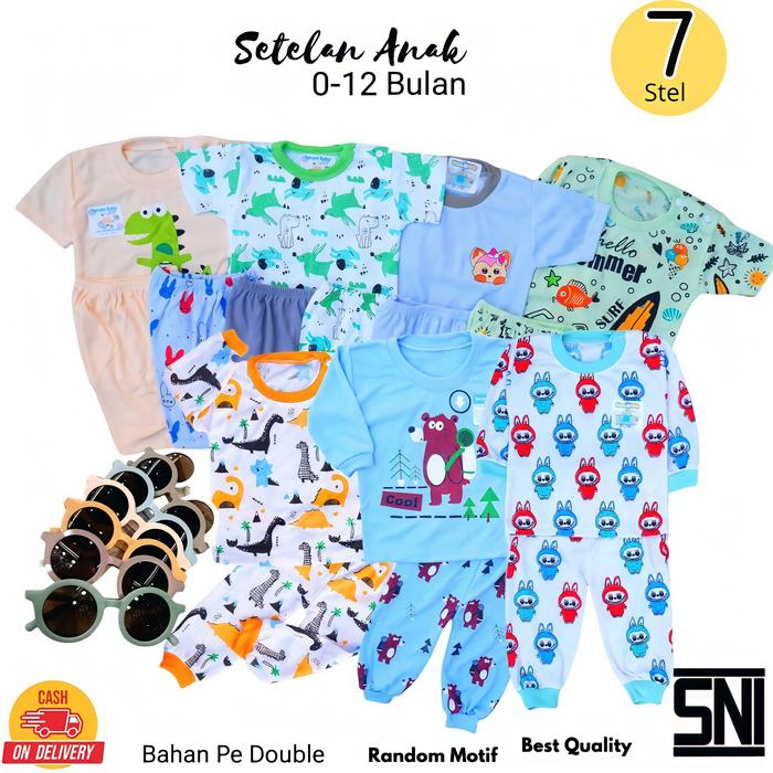 Paket Setelan (Isi 6-7 Pcs) Baju Bayi 0-12 Bulan Mix Motif Cewe Dan Cowo Free Kacamata Bunda Parsel - 3 Panjang 3 Pendek