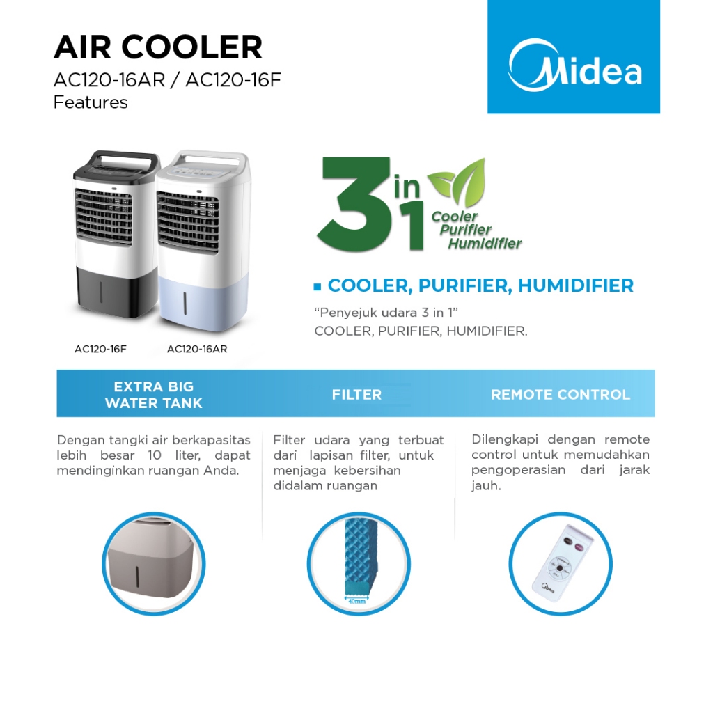 Midea Air Cooler AC120-16F Penyejuk Ruangan Kapasitas 10 Liter Putih