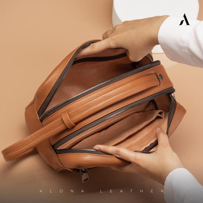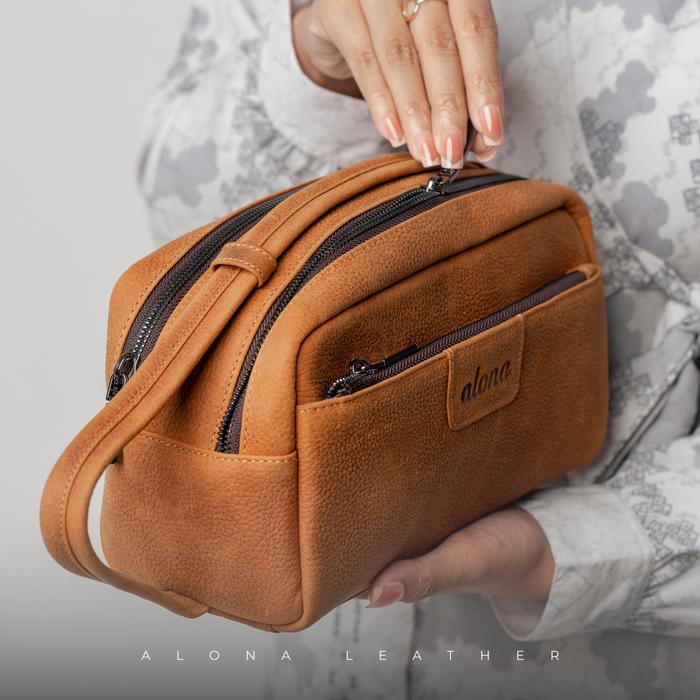 Alona Leather Premium Pouch - Hand Bag Pouch Wanita Kulit Sapi Asli Free Random Gift - Tan
