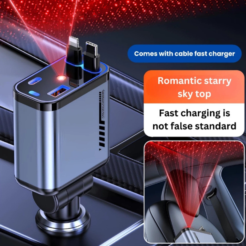 【】4 in 1 Car Charger Retractable LED Light PD 180° Adjustable Car Charger Mobil Adaptor 120W Fast Charging Colokan Mobil TypeC & Lightning