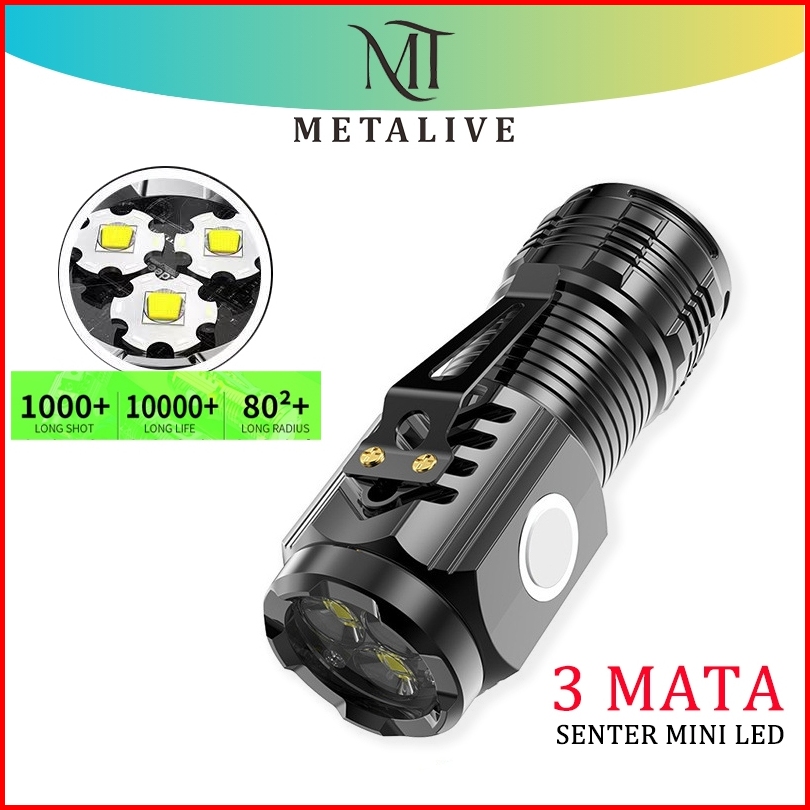 Metalive 3 Mata Lampu Senter Mini Super Terang Senter Emergency Usb Charger Lampu Camping Portabel