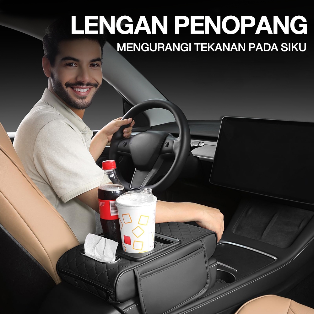 Kotak Penyimpanan Terintegrasi Sandaran Tangan Mobil – Tempat Tisu + Dudukan Botol + Slot HP + Bantal Empuk | Organizer Dashboard Universal