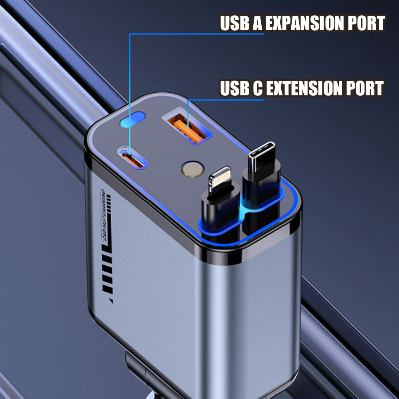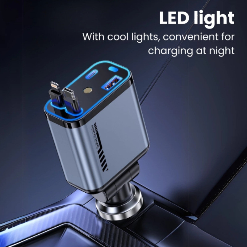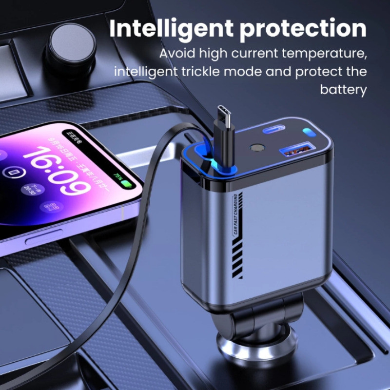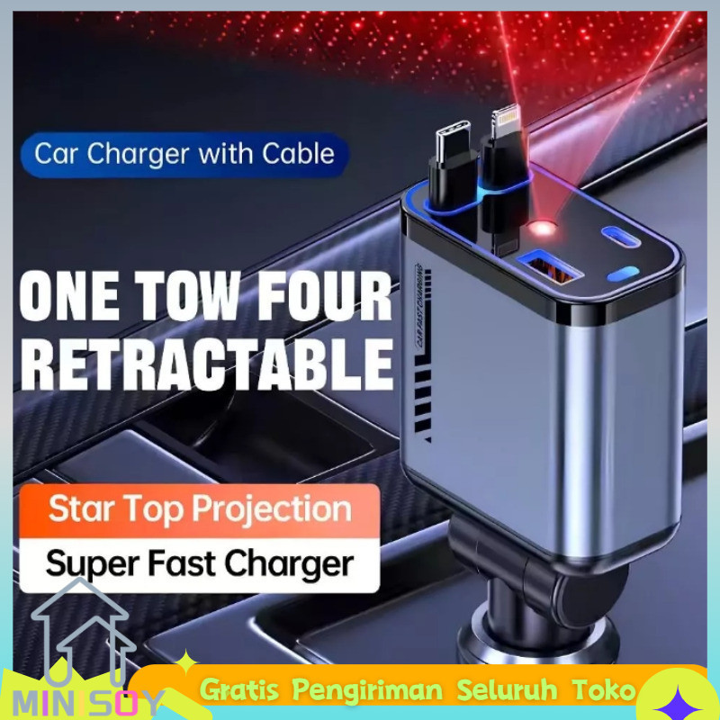 【】Car Charger Mobil Charger 4in1 Fast Charging Rectractable Cable Rectractable Cable 120W LED Display Type C Micro USB Lightning Adaptor Pengisi Daya Cepat