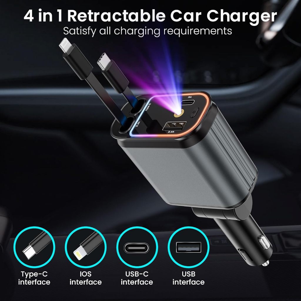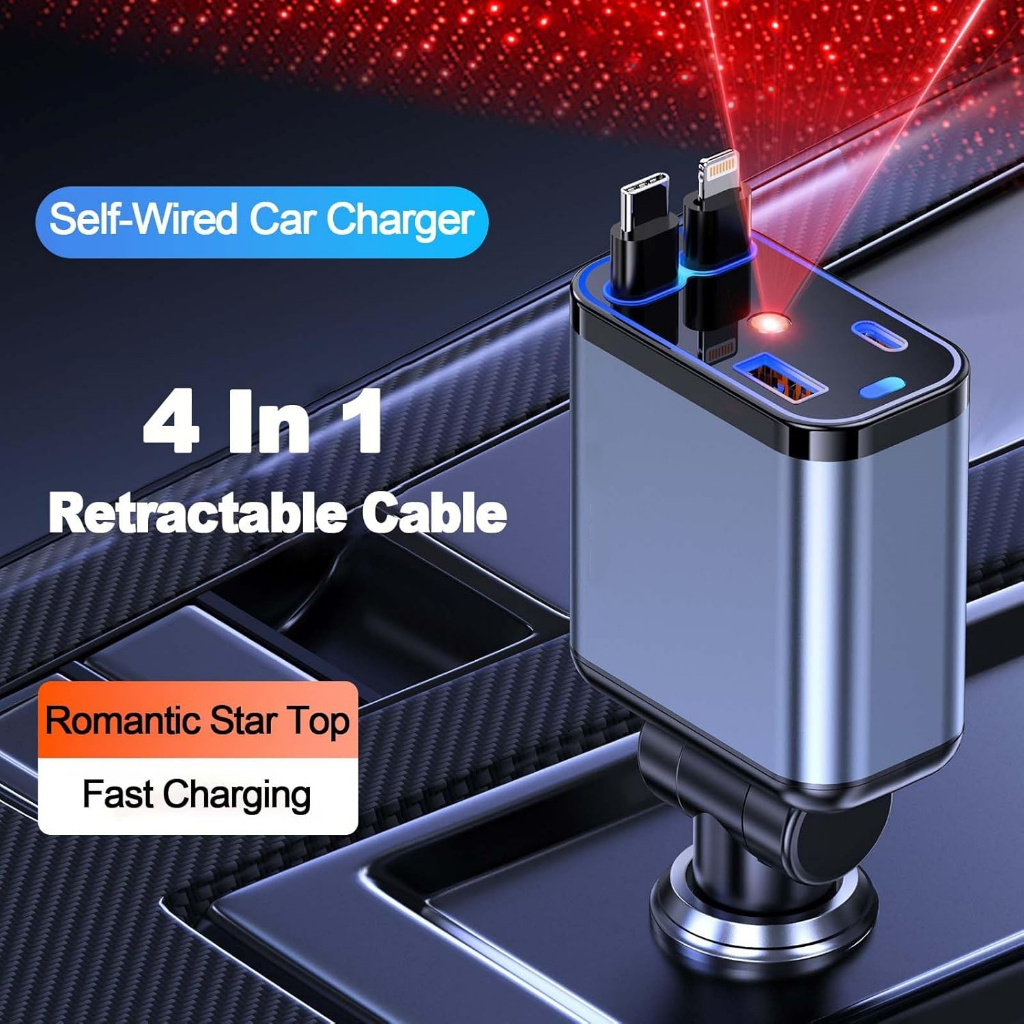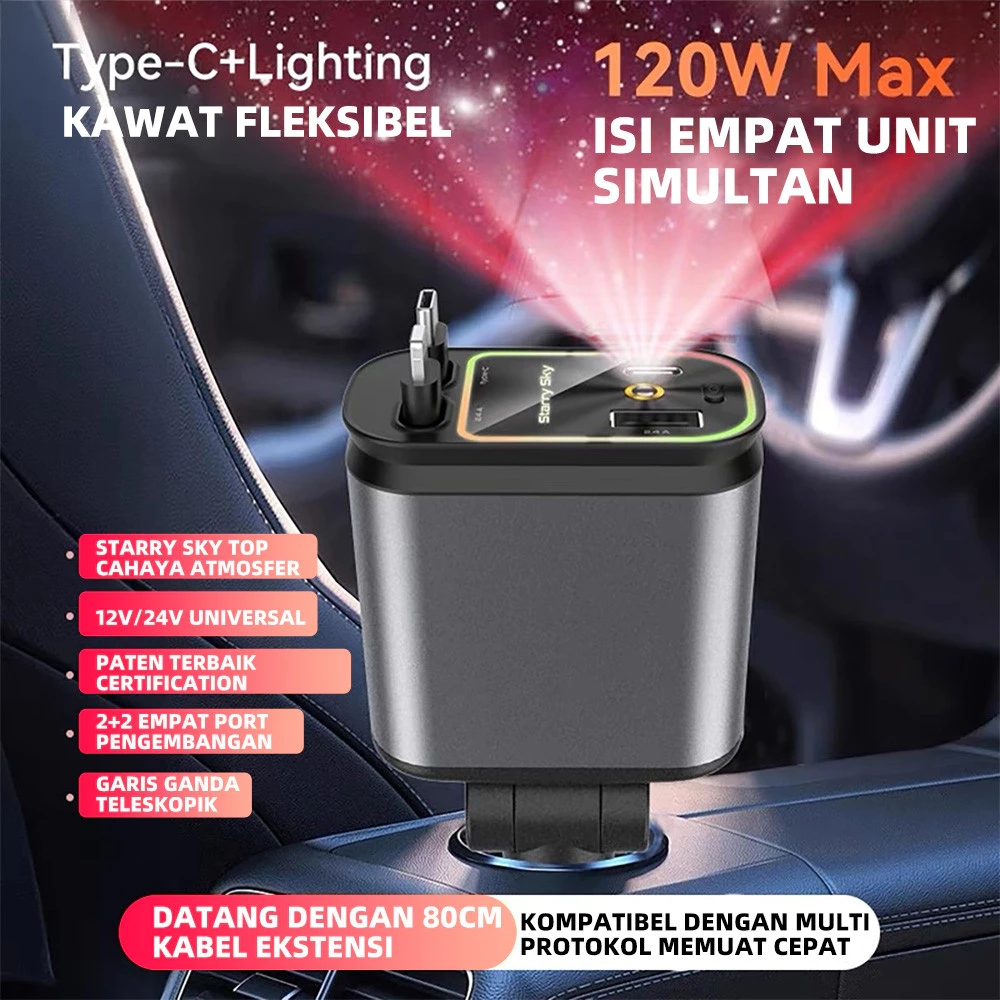 Fast Car Charger with Starry Light 120W Fast Charging Car Charger Mobil & Motor Rectractable Cable 4 In 1 Type-C Dan Iphone USB Type C & Lightning Fast Charging Qualcomm 3.0