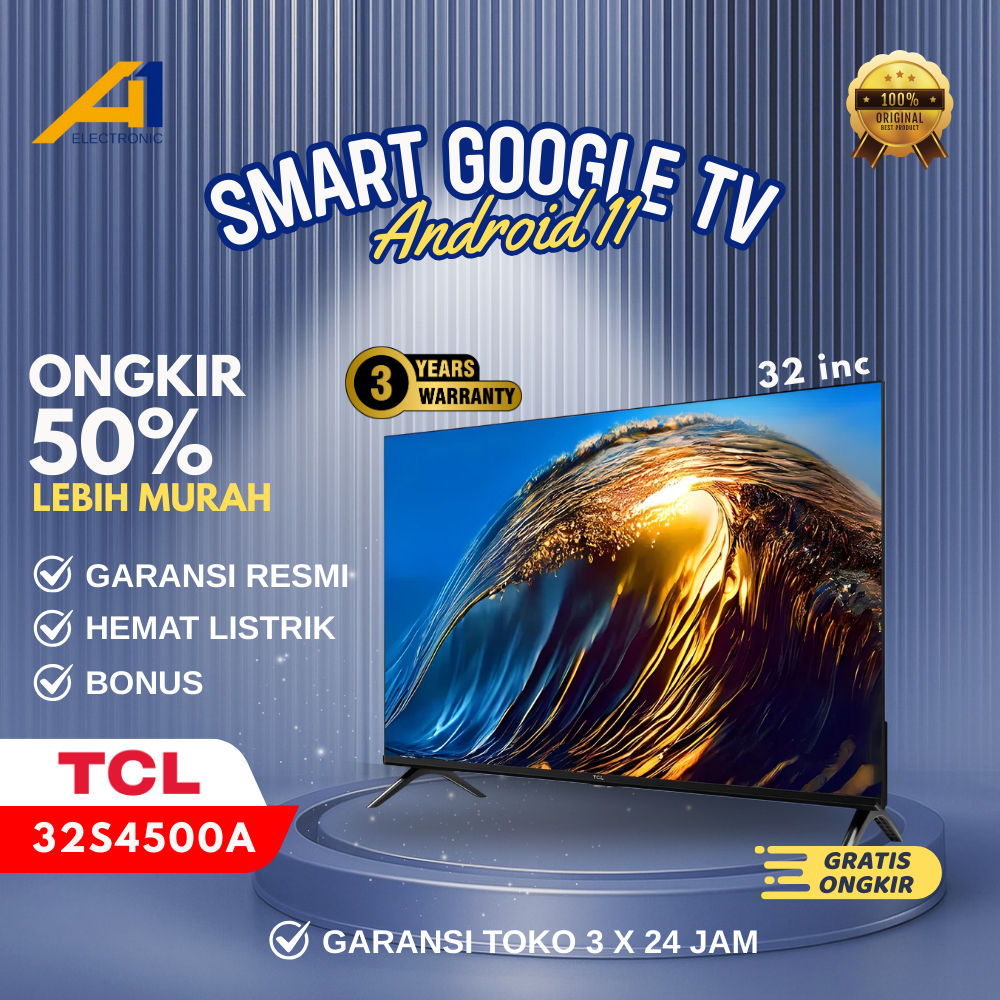 TCL LED TV 32 Inch - Smart Android, HD, Wifi ready, HDMI, USB, Garansi Resmi 3 Tahun - 32S4500A