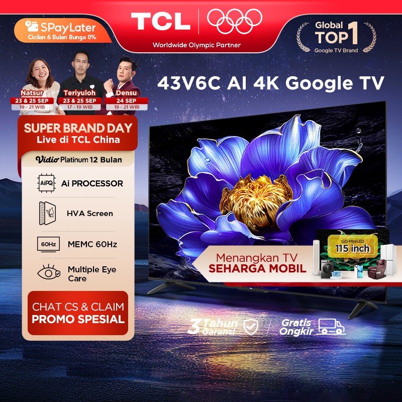 TCL AI 4K Google TV 43 inch V6C - MEMC - HDR 10 - HVA Panel - Dolby Audio - Google Play/Netflix/Youtube/Disney+Hotstar - Smart Android 40 LED Digital Promo Murah (Model: 43V6C)