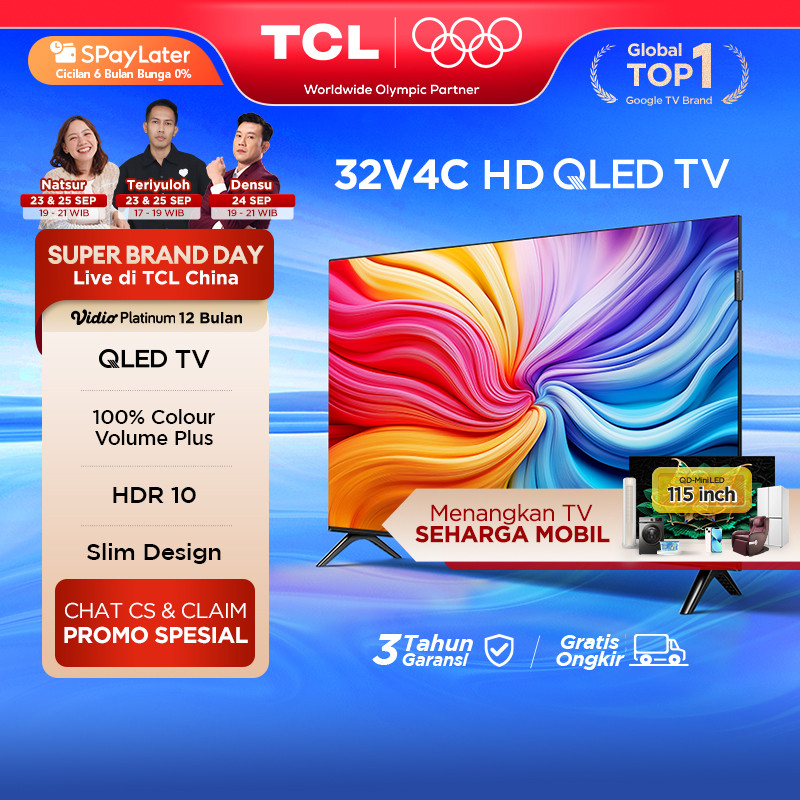 TCL HD QLED Google TV 32 inch V4C - HDR 10 - Dolby Audio - Google Play/Netflix/Youtube/Disney+Hotstar - Smart Android 24 LED Digital Promo Murah G9 (Model: 32V4C)