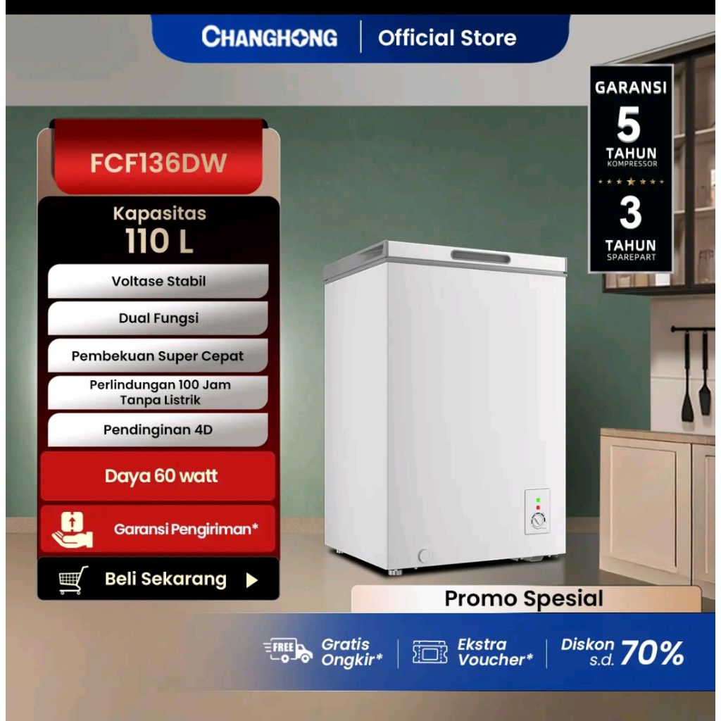 Freezer box chest freezer Changhong 110 liter garansi 5+3 tahun