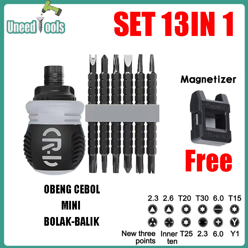 (Free magnetisator) UneedTools Obeng CRV Set 13in1 Obeng Cebol buntek karet Dua Arah bolak balik cebol mini Multifunction Screwdriver set