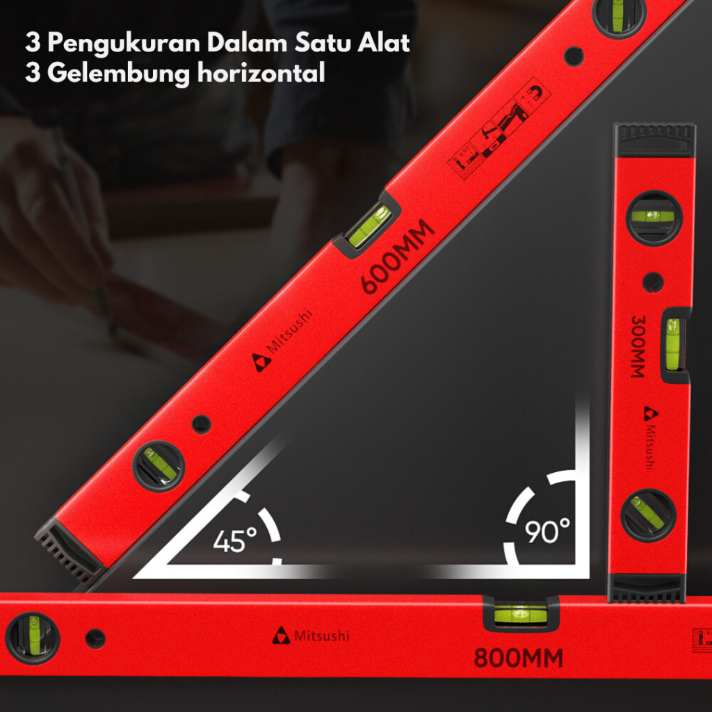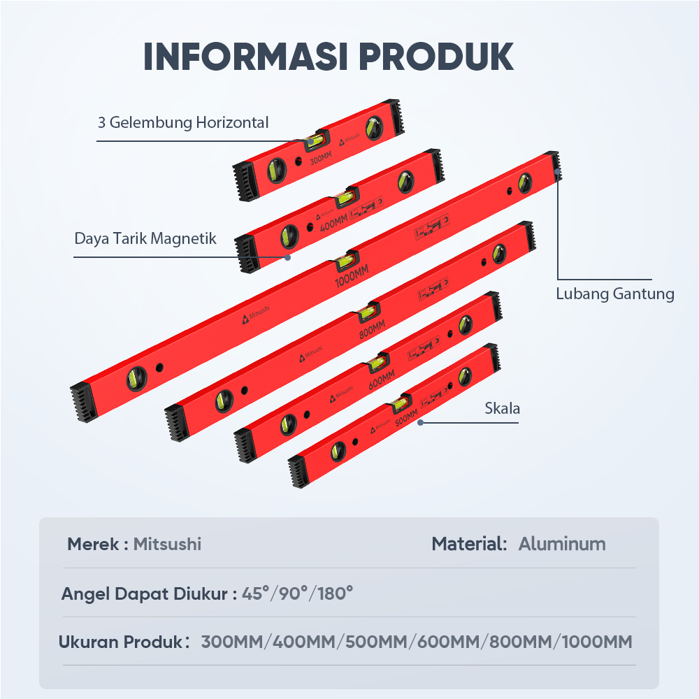 Mitsushi Spirit Level Waterpass Magnet Penggaris Pengukur Horizontal Akurat Perkakas 30/40/50/60/80/100CM