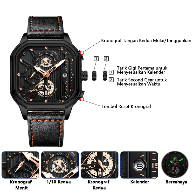 Crrju Fashion Square Dial Kulit Jam Tangan Pria Mewah Olahraga Tahan Air Watch Man Chronograph Quartz Jam Tangan + Kotak