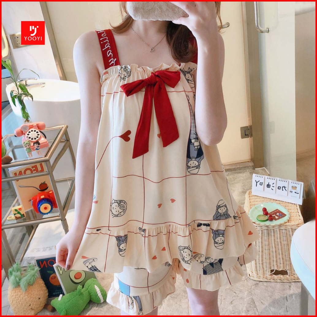 Yooyi Baju Tidur Wanita Piyama Baby Doll Setelan Perempuan Dewasa Tanpa Lengan Celana Pendek Remaja Desain Korea Motif K