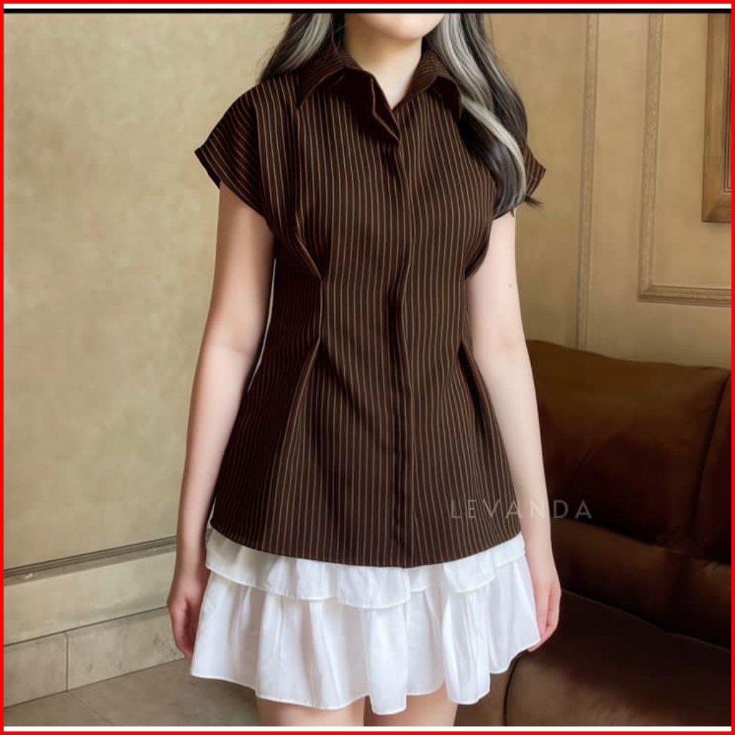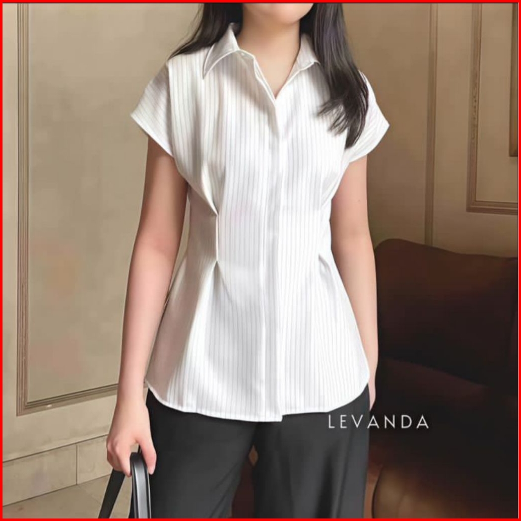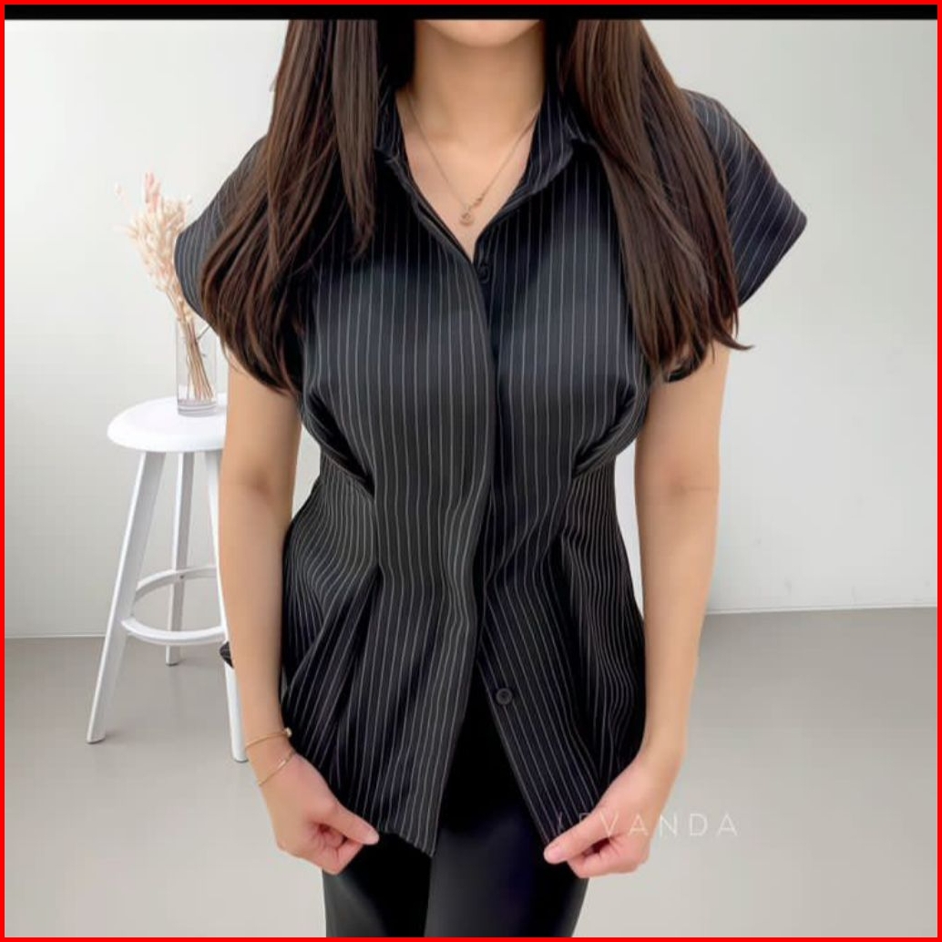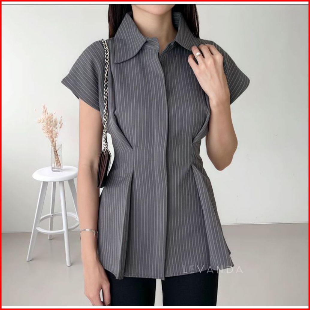 Kemeja Stripe Wanita Kemeja Salur Wanita Lengan Pendek Stripe Fitted Stripe