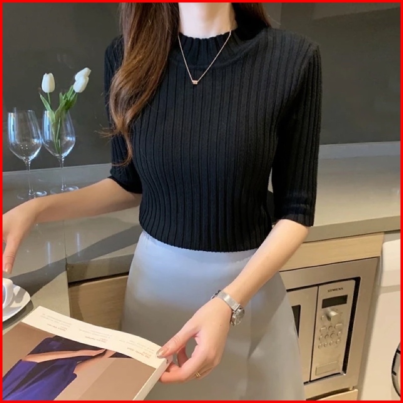 Turtleneck Midi Lengan 3 4 Baju Rajut Wanita Premium