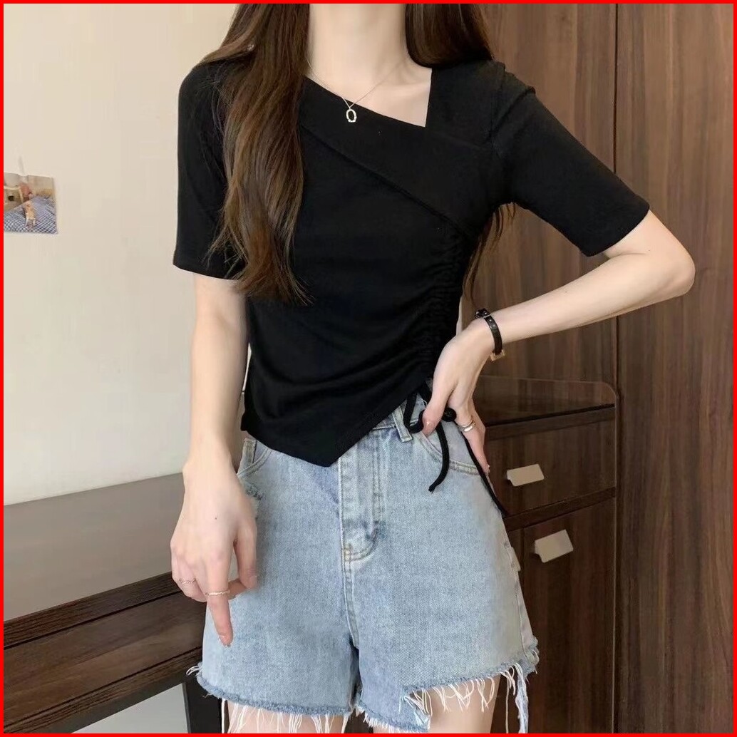 Meirong Kaos Hitam Wanita Baju Kaos Atasan Wanita Black Casual Crop Top Lengan Pendek Terbaru 2025