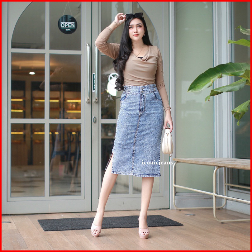 Iconicjeans-cecilia Jeans Skirt Rok Jeans Stretch Pendek Belah Samping Pinggang Karet