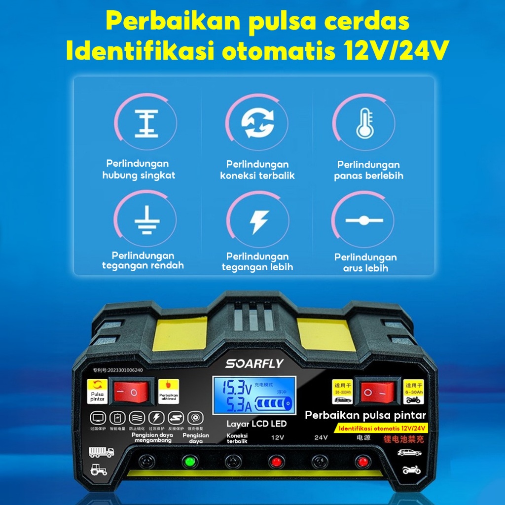 SOARFLY 12V/24V 220W/300W Car Charger Otomatis Aki Mobil Motor Kapal Truk Automatic Fast Smart Charger 220W