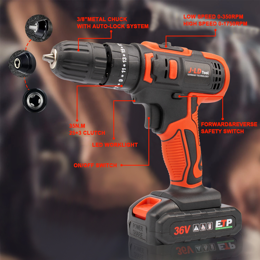 JLD 36vf Mesin Bor Baterai Tangan Cordless Drill impek baterai komplit 10mm bor beton/kayu/dinding/tembok jld tool Impact Bor murah