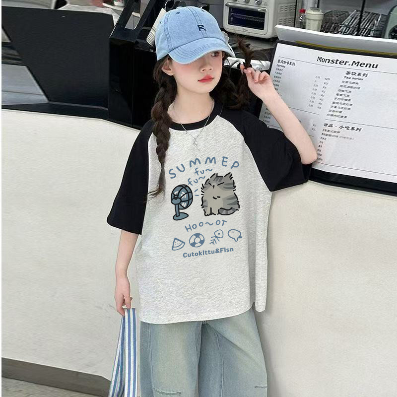 Laozy 2-12 Tahun Baju Anak Perempuan Navy Blue Raglan Short Sleeves Import Korea Kaos Oversize Anak Cute kitten Hair Dry