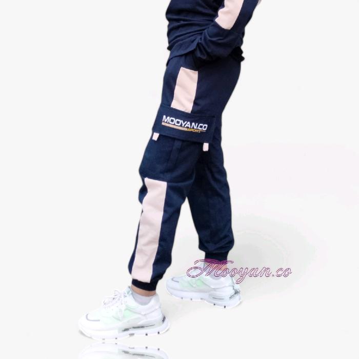 Setelan Olahraga Wanita Jumbo - Baju Olahraga Celana Cargo Wanita Muslimah - Mooyan Set 100Kg - Navy-Cream, M